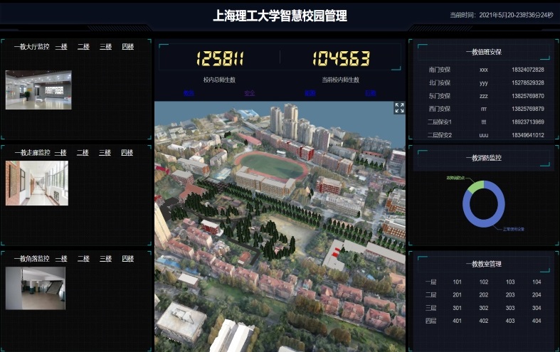 针对上述问题,通过物联网、云计算、大数据、5G、数字孪生、GIS地理信息等核心技术搭建智慧校园三维可视化管控平台,通过对园区的通行信息登记记录、识别多媒体设备、教学仪器以及实时监控设备、电网管廊等使用状态和使用寿命做成数据系统管理,并进行查看及分类管理;基于校区楼宇的CAD图纸输出园区建模3D模型,对校园整体建立空间信息,建模包含全局、局部、楼层、监控设备点位信息、智能设备点位信息、报警区域6大子模块。实现模型与数据的融合呈现,在数据交互的前提上,对应用场景的访问、特权、运维、储存、预警等场景进行分析决策管理,并将校园关键物联点位进行标注并可联动点击查看相应信息。